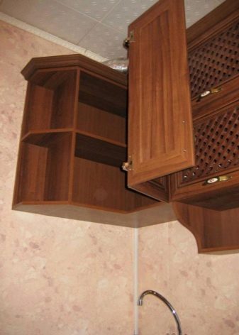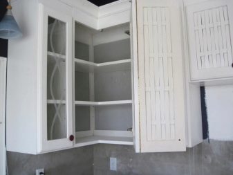 Традиционно горният модул е направен в огледален образ на долния – размерите им съвпадат и почти винаги са 600×600 мм – това е стандартната ширина и височина на конструкцията. Десният ъгъл на горния ъглов шкаф традиционно е в контакт със стената на съседния шкаф, следователно, когато разработвате дизайнерски проект, трябва да се погрижите за удобното отваряне и затваряне на вратите на стенния шкаф.
