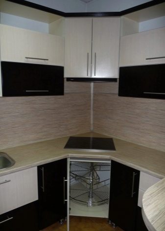 - Вътрешното запълване на ъглови модули е чисто индивидуален въпрос; за да направите долния шкаф по -функционален, изберете неговата трапецовидна форма, между другото, горният шкаф във формат “трапец” също е по -функционален, но едва ли е подходящ за съхранение на съдове.