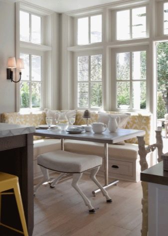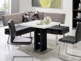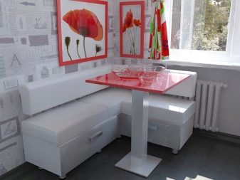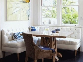 - Лаконичен диван на бяла модерна кухня. Изглежда стилно и модерно.