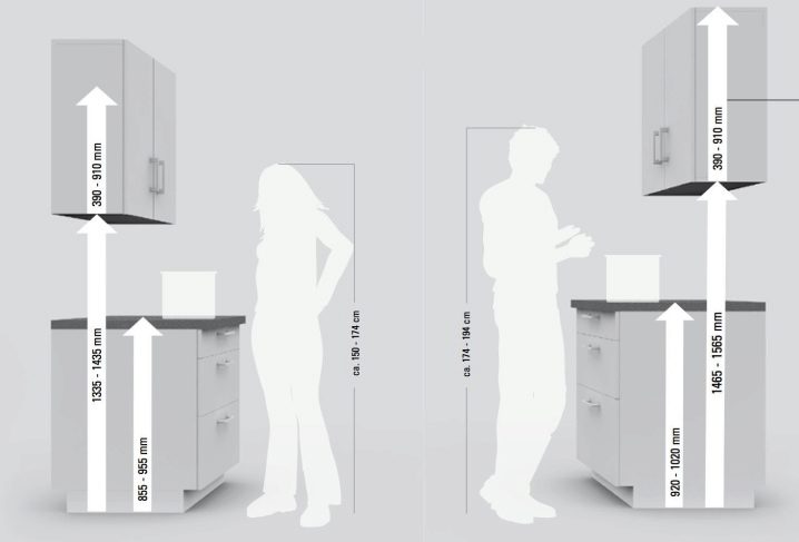 Класическите размери и правилата за поставяне се използват не само за долните маси и чекмеджета, но и за горните шкафове.. При разработването на проект трябва да се вземат предвид следните правила:
