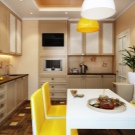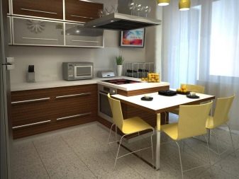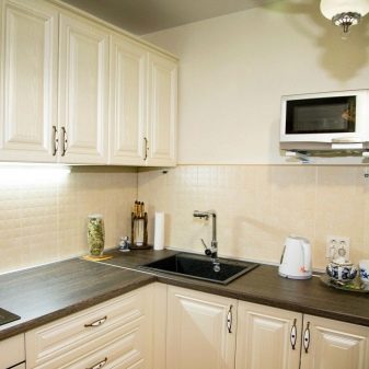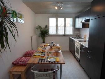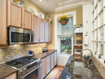 - в два реда. В малки помещения слушалките винаги са позиционирани по този начин. Работната зона се изважда от едната страна, а всичко останало се монтира от другата страна. Дизайнерите препоръчват да оставите печката и мивката от същата страна;