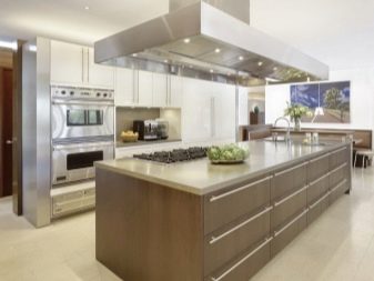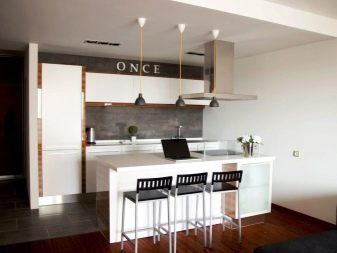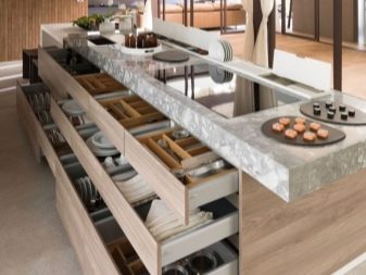 - по тип остров. При този кухненски план в централната част се намират слушалки с зона за готвене. Мивката е инсталирана отсреща, а хладилникът е поставен до стената. Също така понякога мивка се поставя в централната част, но това е по -скъп вариант;