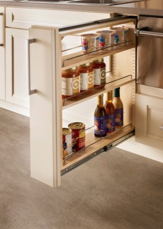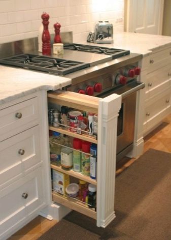 - за да спестите място, използвайте тесни панели – можете да скриете сосове, подправки в тях и да поставите билки, засадени в саксия на горния рафт.