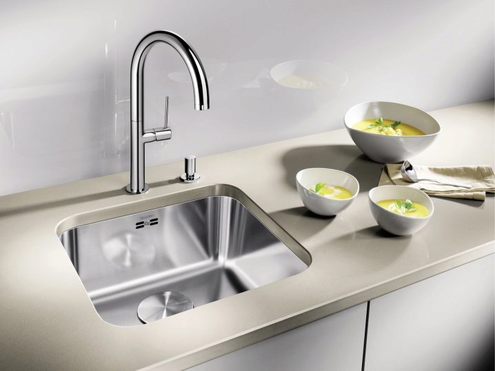 Когато инсталирате мивката, е необходимо да изберете правилния смесител, така че неговият гандър не само да насочи потока в средата на мивката, но и да направи възможно да се замести голям тиган или кофа под него без никакви проблеми..