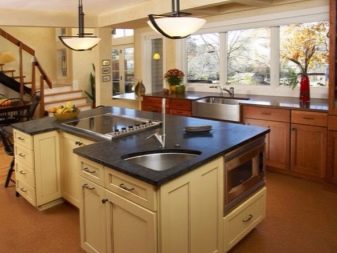 Триъгълна мивка на кухненския остров. Най -подходящата форма за случая.