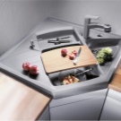За кухни със скосени ъгли от 45 градуса, трапецовидната многосекционна мивка е идеална. Той ще бъде функционален и няма да заема допълнително работно място на масата за рязане..