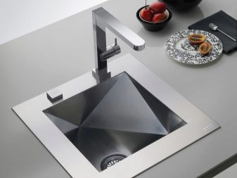 Малка дизайнерска мивка с необичайни геометрични форми ще украси високотехнологична кухня и ще се впише в кухня със съдомиялна машина.