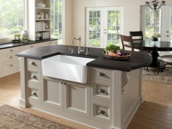 Триъгълна мивка на кухненския остров. Най -подходящата форма за случая.