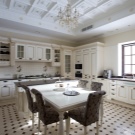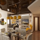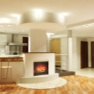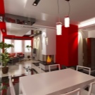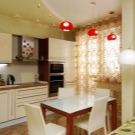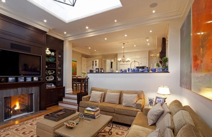 Можете да подчертаете функционалните зони на кухнята-трапезарията и хола, като използвате осветление. Инсталирайте вградени прожектори в кухненската част, а в другата половина полилей на тавана или красива подова лампа. И ако изберете същите осветителни тела за тавана, тогава създайте разлика в цвета: в кухнята има ярко жълто осветление, а в хола е студено синкаво.
