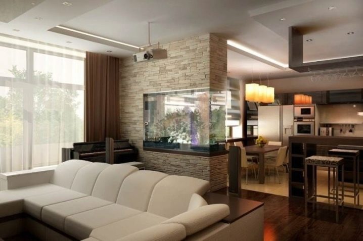 Прост (но не винаги евтин) вариант са различни начини за вътрешна декорация на стени, подове и тавани в различни функционални зони. Можете например да облицовате кухненския бокс с плочки – това е един от най -добрите материали за тази стая, а в зоната на хола да залепите модерни тапети по стените и да покриете пода с ламинат. Таванът може да бъде от един материал, например шарнирен таван с рамка от гипсокартон и боядисване. И направете прехода на тавана от една зона в друга под формата на разлика в нивата. Контрастът на довършителните материали ще донесе отлично визуално разделяне на двете територии. С този метод, разбира се, е необходимо да се вземе предвид хармоничната комбинация от цветове на довършителните материали в две зони. Най -добре е да изберете близки по мащаб нюанси. Не забравяйте за мебелите, които също трябва визуално да се хармонизират в двете функционални области..