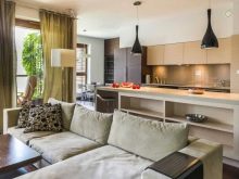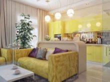 Разделянето на две или три зони с мебели не изисква никакви монтажни работи. Можете просто да поставите масивния диван обратно към кухнята. И вместо да монтирате описания по-горе бар брояч, използвайте готов шкаф или настолна книга от магазин за мебели. Вътрешни помещения с площ 30 кв. метра е възможно да се създадат цели 3 функционални зони: за готвене, трапезария с маса за хранене и хол за цялото семейство. Тогава е по -добре да не използвате никакви масивни прегради и стени, а просто подчертайте границите с мебели или различни опции за декор..