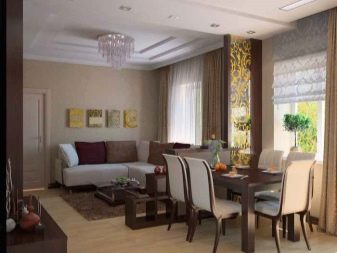 Ако условията на живот позволяват и за съвместно използване на трапезария-хол, стая с площ от 20 кв. м и по -горе, е възможно да се организира напълно комфортна територия с разделяне на функционални зони, в които дори голямо семейство ще бъде удобно. Това важи особено за селска къща, където можете да осъществявате комуникации по свое усмотрение: газ, отопление, вентилация, водоснабдяване и изграждане на красиви прегради. В голяма стая остава само да се направи компетентно зониране – визуално и функционално разделяне на територии: кухня, трапезария, хол. Можете да разгледате няколко вида такъв дизайн..
