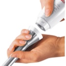 Малкото тегло и специалната форма на дръжката улесняват готвенето, а потапящата част е направена така, че да не позволява пръскане по време на употреба. И най -важното, всички части на блендера могат да се мият в съдомиялна машина. Но корпусът е изработен от пластмаса и моделът не развива твърде висока скорост.