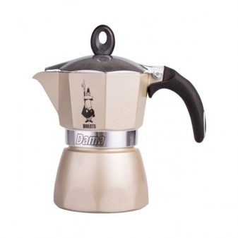 Bialetti dama – друг модел гейзерна кафемашина. Според характеристиките си италианският продукт е много по -добър от предишния китайски аналог, но цената е напълно различна – 1800 рубли. За случая е използвана и алуминиева сплав, иначе моделът е много приличен. Има предпазен клапан за пара и силиконова дръжка. Тя има хубав дизайн. Единственият недостатък е крехкостта на материала за корпуса..