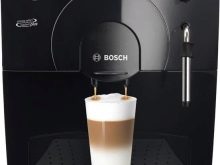 - Bosch TCA 5309. Корпусът на устройството е изработен от пластмаса, отличава се със строг черен дизайн и функционалност. Можете да регулирате вкуса на напитката по сила, нагряване на водата, има функция за предварително намокряне на праха, можете да дозирате вода, да зададете размера на смилане на зърната. Капучино ще трябва да се приготвя на ръка, но пяната върху него, благодарение на налягането от 15 бара, ще бъде невероятна.