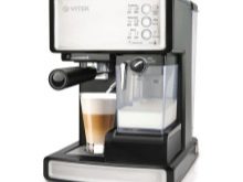 Vitek VT-1513. Устройството заслужава солидна четворка сред подобни модели. Той е доста функционален, така че цената от 4,5 хиляди рубли е напълно оправдана. Машината ще приготвя еспресо, капучино в ръчен режим, има система против капене и подвижна тава върху алуминиев палет.