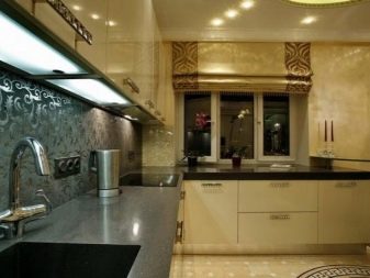 Техниката на асиметрия добавя нотка на изтънченост. Като правило за това се използва ламбрекен или лека органза. Допълнително платно е поставено върху римска сянка, премества се на една страна и е завързано с декоративни шнурове, за да образува гънки. Асиметричен ламбрекен с изобилие от гънки изглежда луксозно, но не е подходящ за малка кухня.