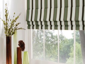 Особеността на раираната тъкан е, че тя не само въплъщава интересни дизайнерски решения в реалността, но и визуално регулира размера на стаята. Римските щори с хоризонтални ивици ще направят прозореца по -широк. Съответно вертикалната ивица ще “опъне” прозореца вертикално.