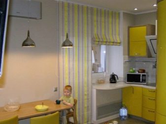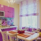Римската щора е идеалният вариант за декориране на кухня с балкон. В жегата, в понижено състояние, той ще ви охлади и ще създаде уютна атмосфера. Освен това завесата може да бъде прикрепена към самата врата. Това улеснява отварянето на балконската врата. Няма нужда да премествате тъканта назад, както е при традиционните завеси.