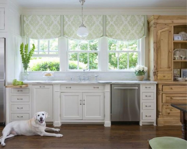 Кънтри стил е въплъщение на уюта в кухнята. За създаването му са подходящи римски завеси с растителен печат, в клетка, в лента..