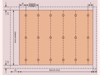 Първоначално е необходимо да се измери отвора на прозореца и да се добавят към надбавките: странични части по 5 см всяка, по 10 см всяка в горната и долната част. Тъканта може да се свие след пране. Ето защо преди да продължите с рязането, трябва да се накисне в топла вода, да се изсуши и да се изглади с ютия. След това, използвайки таблицата, определяме броя на гънките на бъдещата завеса. Ние ги маркираме, както и местоположението на пръстените, с пунктирана линия от шевовата страна на тъканта.