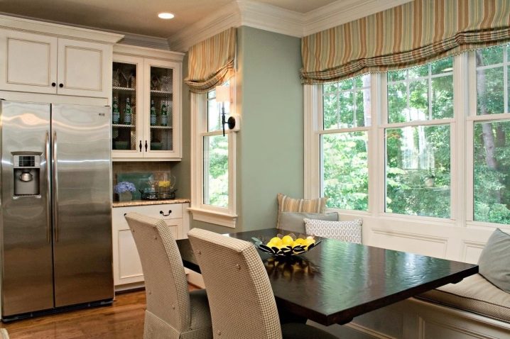 Завесата в двуцветни ивици изглежда лаконична и строга. Ако искате да направите кухнята ярка, тогава изберете плат от няколко цветни ивици..