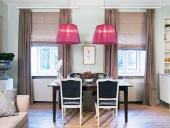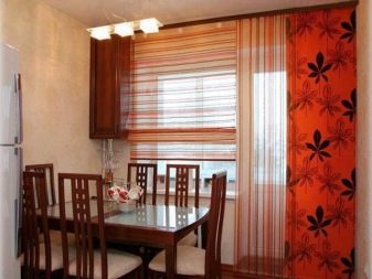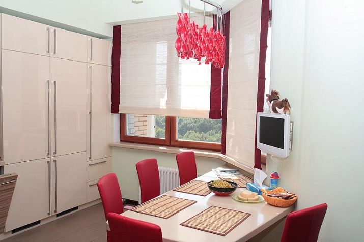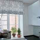 Римската щора е идеалният вариант за декориране на кухня с балкон. В жегата, в понижено състояние, той ще ви охлади и ще създаде уютна атмосфера. Освен това завесата може да бъде прикрепена към самата врата. Това улеснява отварянето на балконската врата. Няма нужда да премествате тъканта назад, както е при традиционните завеси.
