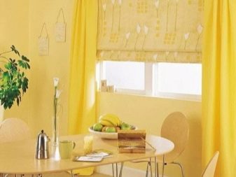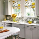 Римските нюанси вървят добре със завеси. Слушалките ще ви развеселят, състоящи се от обикновена завеса и римски нюанси със светъл модел в ярко жълта цветова схема.