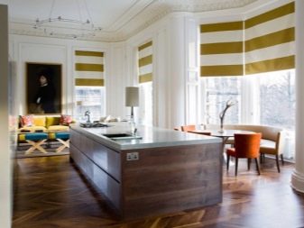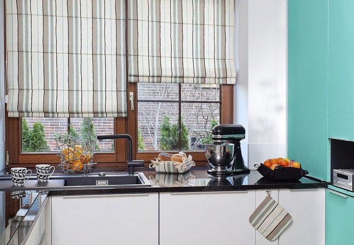 Завесата в двуцветни ивици изглежда лаконична и строга. Ако искате да направите кухнята ярка, тогава изберете плат от няколко цветни ивици..