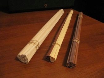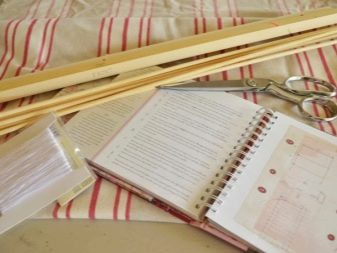 - Пръти / ламели с диаметър 0,5 см, изработени от дърво или пластмаса. В сравнение с ширината на завесата, те са по-къси от нея с 3 см. Общо ще са необходими 7-8 такива пръти;