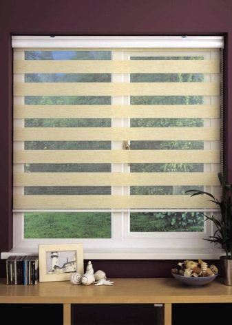 - Ролетни щори – комбинирайте щори и ролка. Материалът в този случай се използва като бамбук, пластмаса, плътен полиестер. Когато се навива, завесата е под формата на щора с характерни хоризонтални или вертикални ивици, които могат да се регулират.