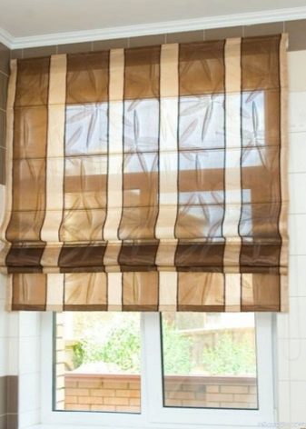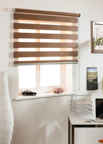 - Ролетни щори – комбинирайте щори и ролка. Материалът в този случай се използва като бамбук, пластмаса, плътен полиестер. Когато се навива, завесата е под формата на щора с характерни хоризонтални или вертикални ивици, които могат да се регулират.