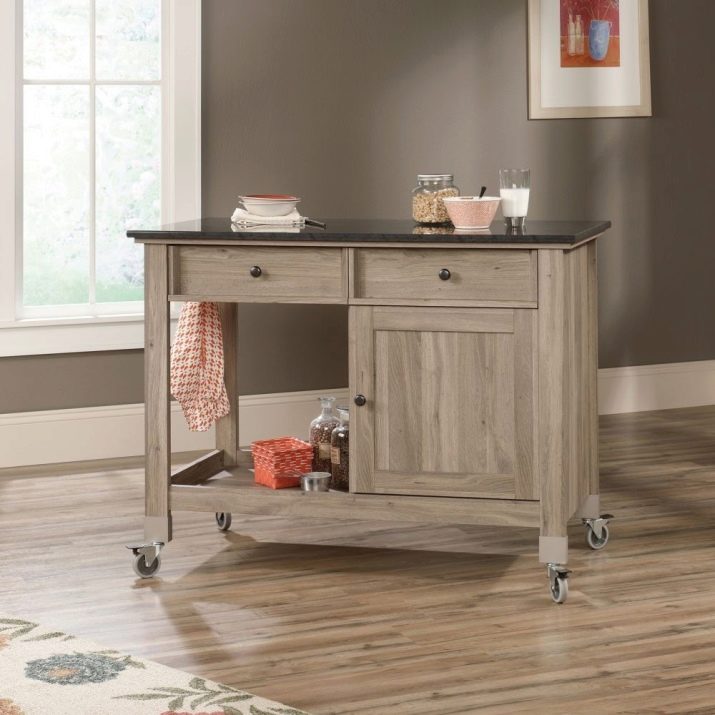 Малък шкаф е и маса. В долната част можете да го използвате като обикновен шкаф с рафтове и да инсталирате плот отгоре. В такъв шкаф е възможно да се готви храна. Тази опция е най -добрата за собствениците на малки кухни. Тя ще бъде незаменима дори при честа смяна на местожителство. В летни вили и летни кухни това е задължително.
