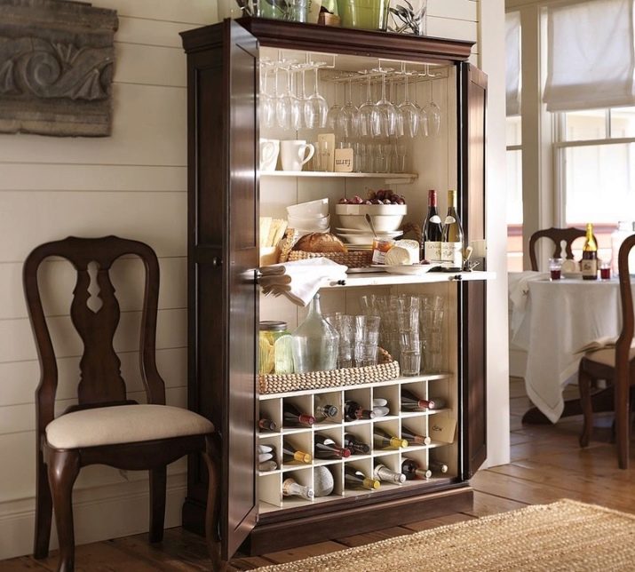 Такъв гардероб е отличен избор за любителите на изискани услуги и сувенири. През стъклената врата великолепните комплекти чинии ще бъдат отворени за очите. Шкафът може да има бар секция, предназначена за красиви бутилки алкохолни напитки. Вратите ще осигурят защита от прах. И ако витрината е отворена, тогава може да се нарече и бюфет.