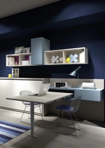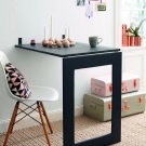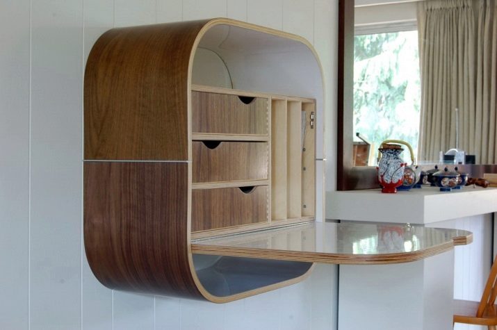 - Най -икономичната за пространство е прибиращата се версия на масата. Той се монтира във всеки подходящ интериорен елемент, например в шкаф и, ако е необходимо, се „изхвърля“ навън. Недостатъкът е относително ниската стабилност и качество;