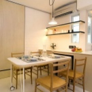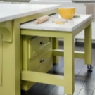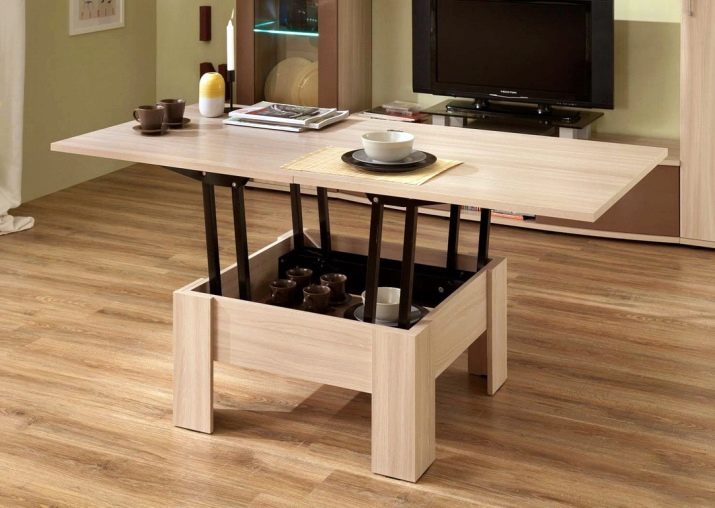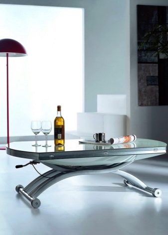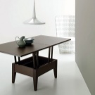 - Трансформираща се маса, която се издига над стойката. В момента има много модели, които се открояват на общия фон с повишена практичност. Например, основата на такава маса може да бъде разположена на стената и да играе ролята на рафтове за съхранение на съдове или други прибори. В същото време в разгънатата версия масата има допълнителни джобове за малки неща..