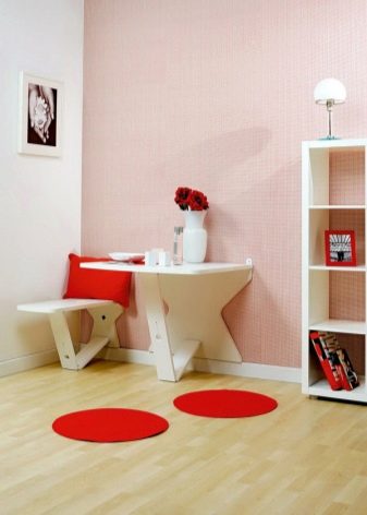 - Сгъваема маса върху опора, която е продължение на независим пиедестал. Тази опция заема малко повече място, въпреки че може да се превърне в доста компактна нощна шкафче, ако работната зона бъде премахната. От друга страна, той е чудесен за четиричленно семейство или за тези, които често имат гости;