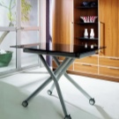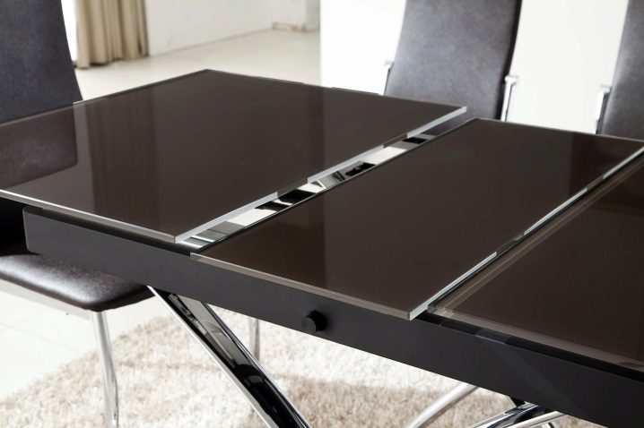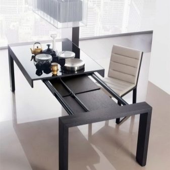 Дизайнът на такива мебели се основава на рамка, сглобена от механични направляващи линии. Те са разположени директно под плота на масата, така че за разгъване на такава маса е достатъчно да я издърпате по водещите линии. Той може да удвои своята площ, докато е достатъчно лек и разглобяването му не е трудно..