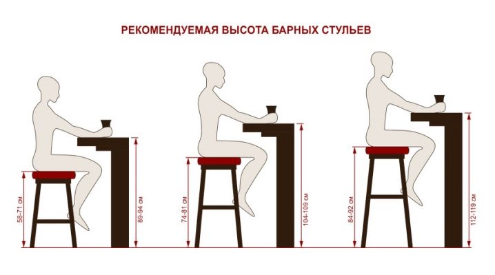 Височината на стола е важен параметър, който трябва да имате предвид при избора на този елемент. На първо място, тя трябва да бъде хармонична по отношение на височината на щангата. За да се изчисли оптималната стойност, е необходимо да се извади височината на седалката от пода от височината на бар брояча. Тя трябва да бъде приблизително 35 см. По този начин, с височина на масата 120 см, височината на стола трябва да бъде приблизително 85-90 см. Тази стойност ще ви позволи удобно да поставите краката си под масата. Не е нужно да се навеждате към масата. Това обаче зависи и от ръста на човека. Следователно този параметър е приблизителен..