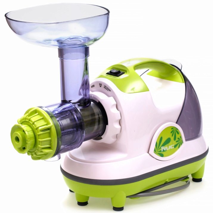 Въртенето на този дизайн на винт има доста ниска скорост. Неговата работа започва по следния начин: необходимо е да се потопят продуктите, предназначени за изстискване в гърлената част, които се смачкват от шнека и се придвижват към филтъра, а сладкишът излиза на сухи ленти през специални малки дупки. Работата на това устройство е ограничена във времето, продължителността му е десет минути при един подход. За да предотвратят прегряване на устройството, производителите оборудват добри и висококачествени модели с винтова система със система за автоматично изключване след около двадесет минути след непрекъсната работа..