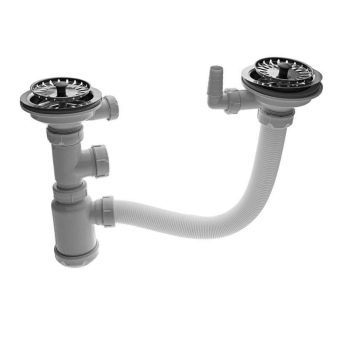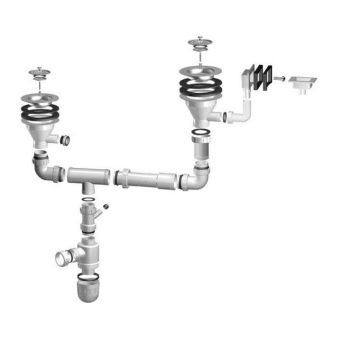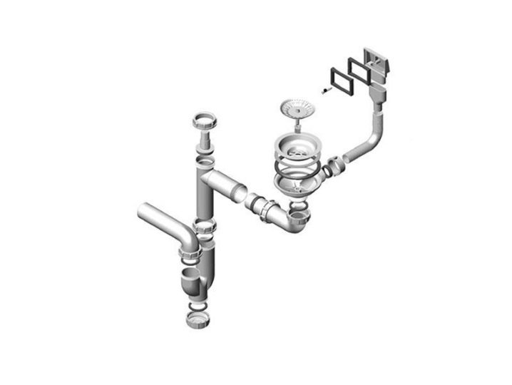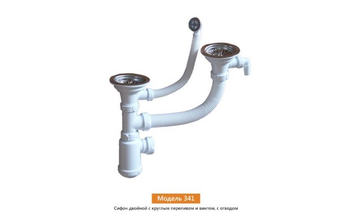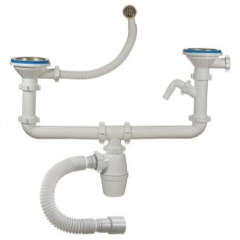 Можете също да изберете тази дренажна система за няколко мивки. Необходимо е, ако вашата кухненска мивка има няколко купи. Двоен сифон обикновено има само един преливник, който се прикрепя към основната мивка, въпреки че някои модели имат до 6 изхода.