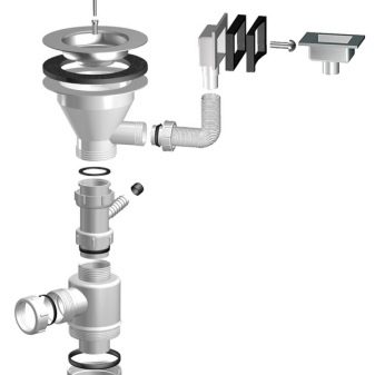 Първоначално поставете всички уплътнения на местата им. След това започнете да сглобявате конструкцията. Колбата се поставя, изходната тръба се завинтва, като първо се хвърля гайка с резба върху нея и се завинтва към колбата. След това гофрирана тръба е прикрепена към средния отвор на сифона.