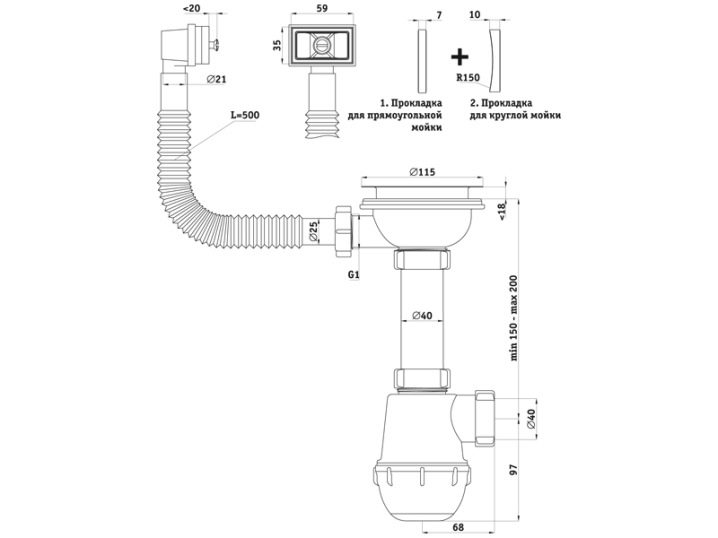 Сифон с преливник се състои от гофрирана дренажна тръба, колба, преливник, дренажен отвор, който е прикрепен към мивката, различни уплътнения и крепежни елементи.