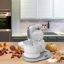 - Стационарни смесители имат сгъваем или подвижен дизайн, в който има основа с купа. Използването на такива устройства е лесно и удобно: ръцете са свободни и можете едновременно да правите други неща. Стационарният миксер е универсален тип оборудване, което може да работи ефективно за дълго време. В сравнение с ръчния модел, той е по -мощен и има по -висока производителност. Благодарение на разширените си функции, той може да се справи с най -трудните задачи, например разбиване на плътно тесто.