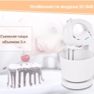 - SC-HM40S01 миксер с ниска мощност с два вида приставки и пет скорости на работа. Идеален за разбиване на кремове и яйца, а може да се използва и за приготвяне на тесто. Има турбо режим на работа, което значително намалява времето за готвене.