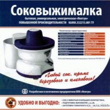 Сокането у дома изисква мощна сокоизстисквачка. Ако планирате да “навиете” няколко буркана за зимата, тогава можете да направите с обичайния домакински модел, но ако имате огромна реколта от ябълки, ще ви е необходим промишлен професионален апарат за изстискване на сок. На пазара на сокоизстисквачки с откъсване, местен производител е начело "Нептун". Устройството му може да преработи 130 кг ябълки за няколко часа без предварителна обработка (рязане и белене). Друго предимство на това устройство е неговата ниска цена. Сега тя може да бъде закупена на приблизителна цена от 4800 рубли. Малко вероятно е за такива пари да си купите маркова сокоизстисквачка със същите характеристики..