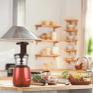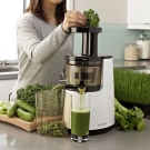 - Удобство в дизайна и лекота на използване. В сокоизстисквачката шнекът е разположен вертикално и има специална широка уста за хранене на плодове и зеленчуци. Съществуващият тласкач позволява бързо и безопасно зареждане на суровини за преработка. Дори дете може да се справи с този вид работа..