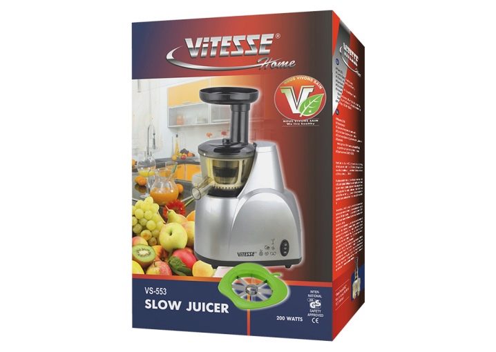 - “Vitesse VS-553” принадлежи към универсалния тип шнекова сокоизстисквачка, от висока ценова категория. Това устройство има метален корпус, няколко филтъра, които регулират количеството на целулозата. Устройството има високо ниво на мощност и достатъчно големи контейнери за целулоза, сок. Ако сте почитател на качеството и комфорта, този уред е създаден за вас..