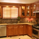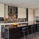 Дължината на гърба зависи от дължината на кухненския модул и позицията на печката и мивката в кухнята. Ако те са в края на групата (в една или различна), тогава трябва да бъде защитена допълнителна част от стената (50-70 см или от размера на дълбочината на работната повърхност – от стената до външния ръб ). Ако страничното прилягане (т.е. позицията на шкафовете на стената по дължината) в горната и долната част на слушалките съвпадат, престилката може да бъде направена права (включително тази част от стената, покрита с други мебели или уреди) или с леко надбавка по дължината. Ако не, тогава в зависимост от материала и неговата дебелина, ъгълът е заоблен или оставен прав.