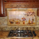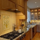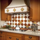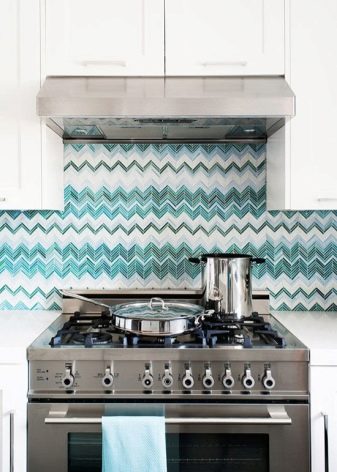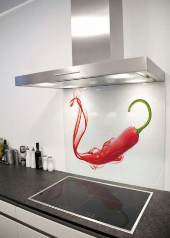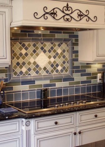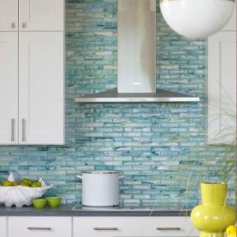 Случва се плотът да се намира отделно от основната мебелна група или горното пространство между стенните шкафове остава непълно запълнено (със специални проекти на индукционни печки или по желание на собствениците). В допълнение към модулни абсорбатори, камина система може да се използва в частни къщи. В тези случаи се препоръчва да поставите кърпата на престилката около качулката и допълнително да защитите съседната зона с керамични, пластмасови или стъклени плочки, които ще допълнят основната престилка или ще направят красив контраст с нея в рамките на цялостния дизайн. Плочките се полагат по 5-10 см всяка (в зависимост от нейния размер). Когато използвате други материали под капака, престилката се издига с 1 см нагоре и 3-4 отстрани.